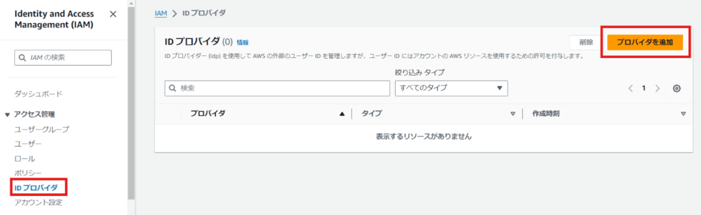 AWSマネージメントコンソールでIAMに移動し、「IDプロバイダー」→「プロバイダーを追加」を選択します