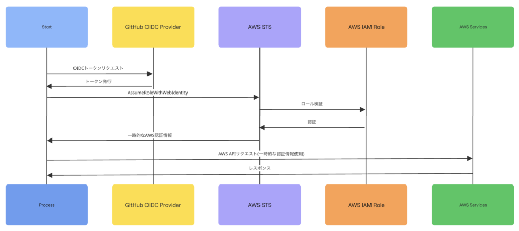 GitHub ActionsでAWS IAMロールのOIDC認証フローは通常の下記のようになります。